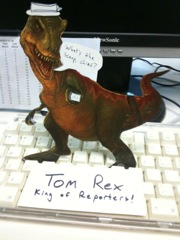 I hope you'll all join me in welcoming Tom Rex to the staff. Tom's been angling for Mr. Jacobs' job for years, and though his editing skills are understandably a bit out of date, he's shown a remarkable level of enthusiasm and can-do spirit. A former newspaperman, Tom is already adjusting to his new role, and his trademark catchphrase—"What's the scoop, chief?"—will surely never get old. Welcome, Tom!